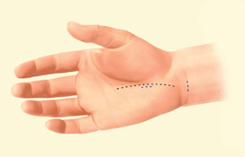 Pressure on the median nerve in the carpal tunnel must be relieved to repair this condition. An incision is made from the middle of the palm to the wrist, allowing access to the constricted tissue causing pressure on the nerve. An alternate procedure is referred to as an endoscopic carpal tunnel release, with smaller incisions (see blue dotted lines) and the use of a surgical microscope or endoscope, a small flexible tube that contains a light and lens, to release pressure.